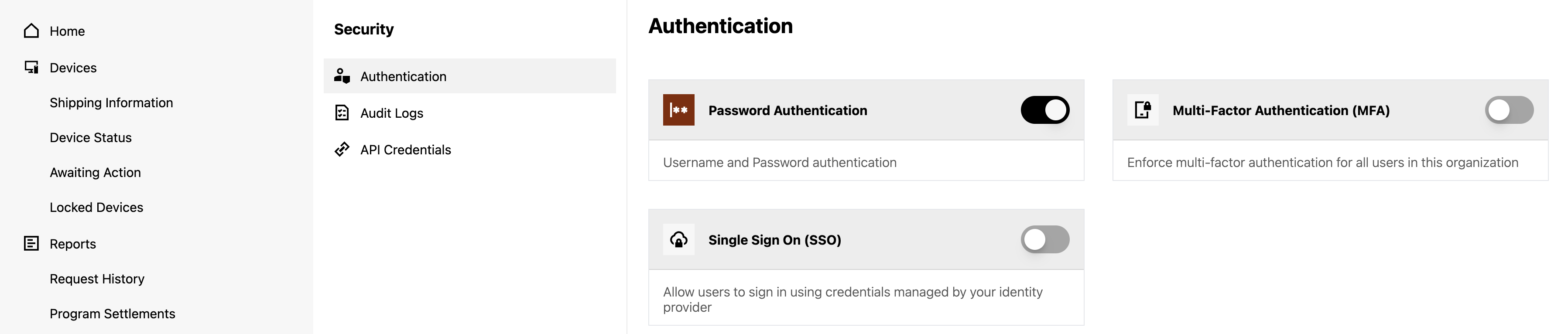 - Select Security > Authentication in the Admin Settings Menu