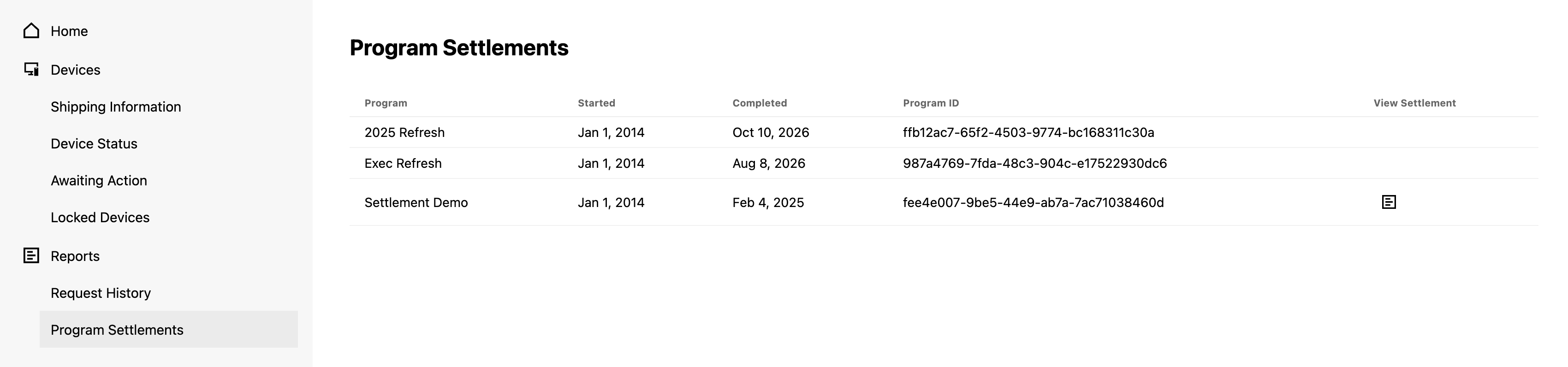 The Settlement Report provides a financial overview at the conclusion of a recovery effort focused on a targeted quantity of leased devices.